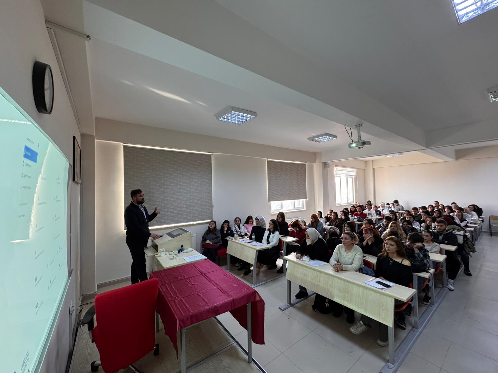 Konuşmacı Oğuz Duman, stajın öğrencilerin mesleki gelişimi ve iş hayatına hazırlık sürecindeki önemine vurgu yaparak, öğrencilerin karşılaşabileceği sorunlar ve çözüm yolları hakkında bilgilendirmede bulundu. Öğrencilerin merak ettikleri soruların da yanıtlandığı seminer, interaktif bir ortamda gerçekleştirildi.